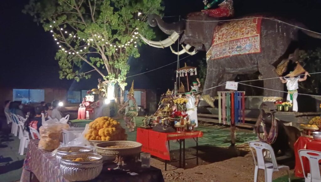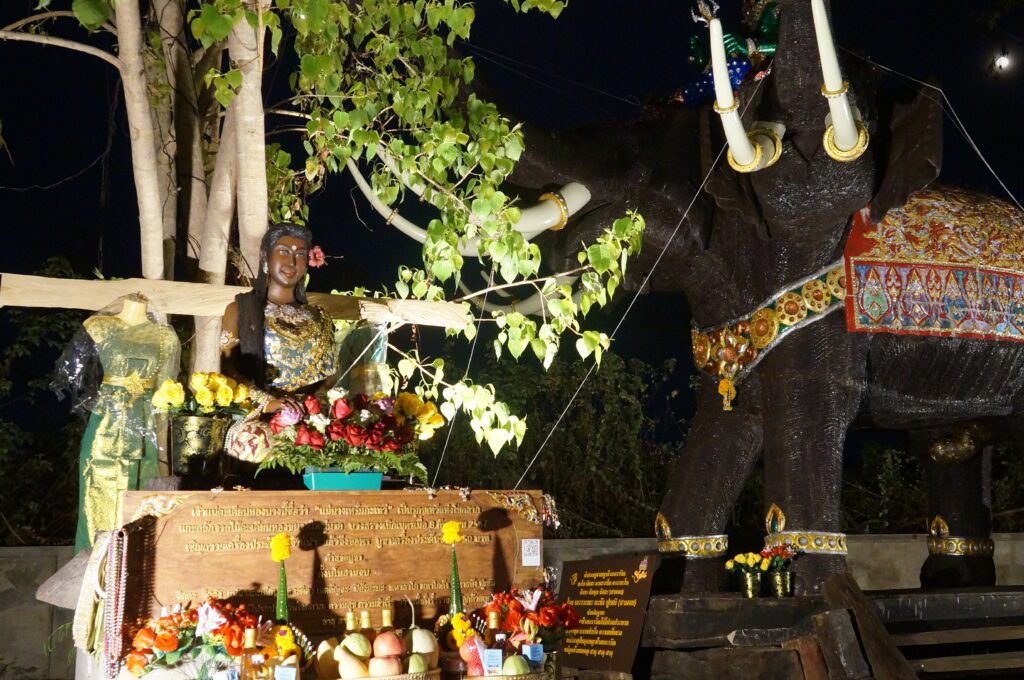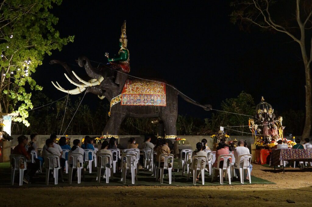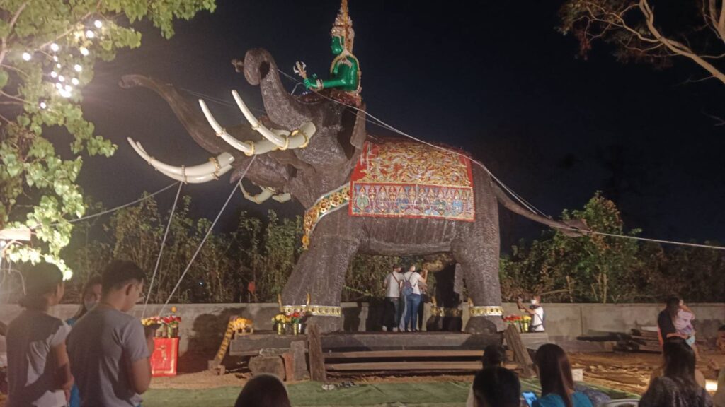 วันนี้ได้นำมาประดิษฐานไว้ที่บริเวณเทวาลัยริมถนนราชพฤกษ์ เป็นศักดิ์ศรีของสล่าเชียงใหม่ ซึ่งถือว่าเป็นถนนสายสักการะ เส้นทางนี้มีพระเจ้าทันใจ วัดพระธาตุดอยคำ จังหวัดเชียงใหม่ พร้อมทำพิธีบวงสรวง และนำนางรำ มารำถวายบริเวณหน้าพญาช้างเอราวัณ โดยมีประชาชนที่มีความศรัทธามาร่วมพิธี ประชาชนที่มาร่วมพิธีได้นำทองคำเปลวไปติดที่พญาลึงค์ ของพญาช้างเอราวัณ ขอพร และความเป็นสิริมงคล