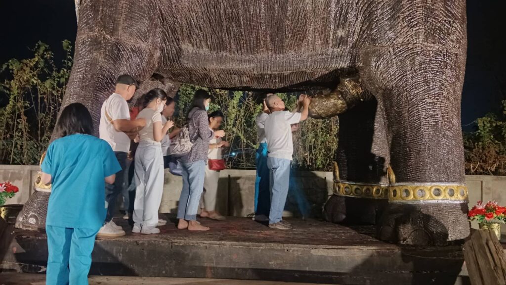 เชียงใหม่ ประชาชน และนักท่องเที่ยว แห่ลอดท้องช้างและติดทองคำเปลว พญาลึงค์ หรืออวัยวะเพศพญาช้างเอราวัณสามเศียร ที่มหาเทพตะเคียนทอง หน้าวงช้างพืชสวนโลกเชียงใหม่ ตามความเชื่ออายุยืน (คลิป)
