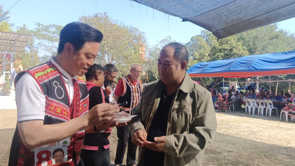 นายจักรพล ตั้งสุทธิธรรม หรือ“ท๊อป” อ้อนขอคะแนนกลุ่มชาติพันธุ์ลาหู่ ร่วมกินข้าวปุกโชว์ ฉลองปีใหม่ลาหู่ บ้านป่าตึงน้อย อ.ดอยสะเก็ด จ.เชียงใหม่