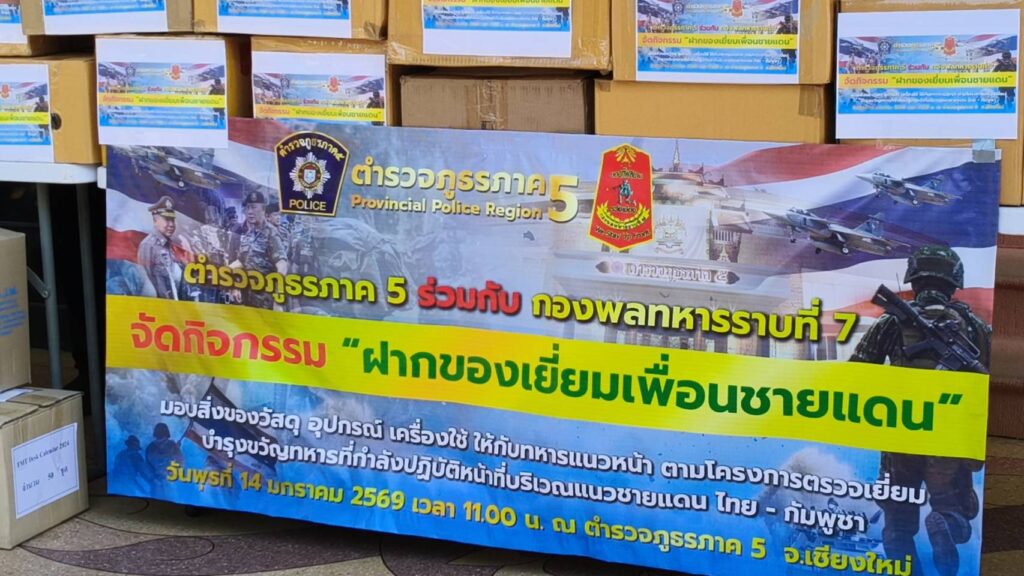 วันนี้(14 มค.69) เวลา 11.00 น. บริเวณหน้าอาคารที่ทำการตำรวจภูธรภาค 5 อำเภอเมือง จังหวัดเชียงใหม่ ได้มีการจัดพิธีส่งมอบสิ่งของอุปโภคบริโภคตามโครงการ “ฝากของเยี่ยมเพื่อนชายแดน” ซึ่งเป็นการผนึกกำลังระหว่างหน่วยงานตำรวจและทหาร เพื่อสนับสนุนการปฏิบัติหน้าที่ของรั้วของชาติ