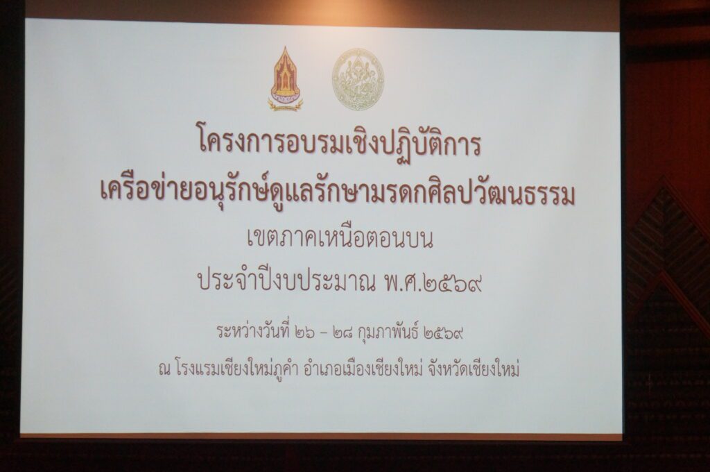 การอบรมเชิงปฏิบัติการเครือข่ายอนุรักษ์ดูแลรักษามรดกทางศิลปวัฒนธรรม เขตภาคเหนือตอนบน ประจำปีงบประมาณ พ.ศ. 2569 จัดขึ้นระหว่างวันที่ 26 – 28 กุมภาพันธ์ 2569 ณ จังหวัดเชียงใหม่ โดยมีการบรรยายเสริมสร้างความรู้ ความเข้าใจในบทบาทหน้าที่ของเครือข่ายอนุรักษ์ ความรู้เกี่ยวกับแนวทางและมาตรฐานในการดูแลรักษามรดกทางศิลปวัฒนธรรมด้านโบราณสถาน ศิลปกรรมในเขตโบราณสถาน และโบราณวัตถุ ศิลปวัตถุ ตลอดจนมรดกทางศิลปวัฒนธรรมอื่นๆ ส่งเสริมให้เล็งเห็นคุณค่าและความสำคัญของมรดกทางศิลปวัฒนธรรมที่มีต่อชาติและท้องถิ่น รวมถึงความรู้ด้านกฎหมาย กฎ ระเบียบที่เกี่ยวข้อง ภายใต้หน้าที่และความรับผิดชอบของกรมศิลปากร โดยวิทยากรผู้ทรงคุณวุฒิ นอกจากนี้ยังนำผู้เข้าร่วมอบรมศึกษาดูงานการบูรณะโบราณสถานในพื้นที่จังหวัดเชียงใหม่อีกด้วย