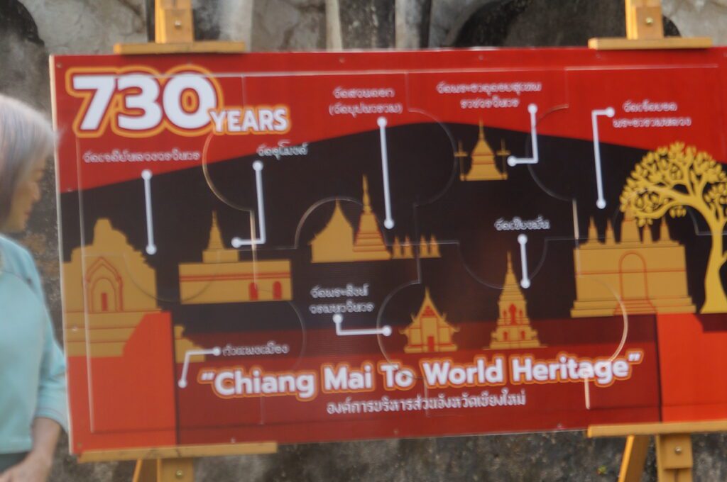 โดยกิจกรรที่จัดขึ้น มีการแสดงศิลปวัฒนธรรมล้านนาการฟ้อนเล็บ ในวาระครบรอบ 730 ปี เชียงใหม่สู่มรดกโลก การขับบทเพลงแอ่วปี๋ใหม่เมือง ขับร้องโดย นางสาวมณีรัตน์ หรือ อ้อม รันตนัง ฑูตมรดกทางวัฒนธรรมเมืองเชียงใหม่ รวมถึงกิจกรรมปักตุงลงบนกองทรายเนื่องในงานประเพณีสงกรานต์ และนิทรรศการเชียงใหม่ สู่มรดกโลก (Chang Mai to World Heritage )